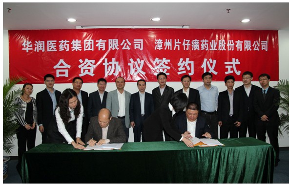 近日,片仔癀药业股份有限公司冯忠铭董事长与华润医药集团有限公司李福祚总经理在深圳举行合资协议签约仪式,签订《合资协议》,双方共同投资10亿元成立合资公司,片仔癀药业投入金糖宁、心舒宝等5个中药独家品种,复方片仔癀含片等3个片仔癀衍生产品。按计划,3年内合资公司年销售额将达2亿元,10年内将合资公司发展成为年生产销售额超20亿元、净利润超2亿元的特色制药企业。