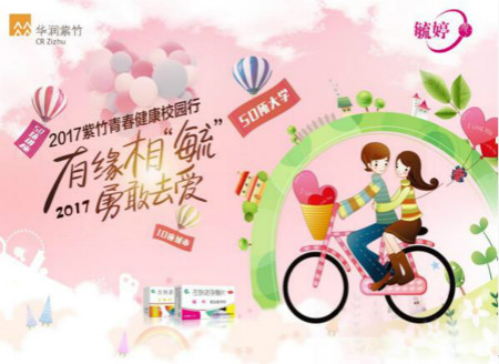 2017“紫竹青春健康校园行”以有缘相毓,勇敢去爱为主题进行校园宣讲活动。于5月3日在沈阳大学温暖启动,在为期43天的活动期间里,共走进了沈阳、哈尔滨、贵阳、济南4个省份的20所高校,影响辐射28万高校大学生。此次活动累计发放礼品20000余份,近12000人参与了外场活动,超过5000人参与了内场的青春期生殖健康知识讲座。本活动旨在帮助大学生们正确了解青春期健康知识,增强自我保护意识,树立正确、健康的生理健康观念,华润紫竹的品牌形象受到高校师生的广泛赞誉。