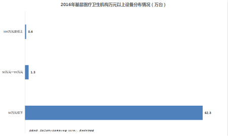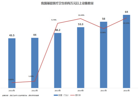 得益于政府对基层医疗设备采购的资金投入,基层医疗卫生机构拥有设备数量快速增长,尤其自2013年起,设备数量维持高增长率,无颓势显现。基层医疗机构配备完善的医疗设备,并且不断更新,有助于提升基层医疗服务质量。