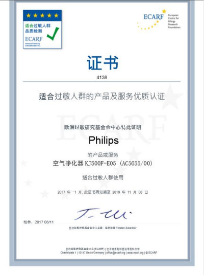 同时,飞利浦5000系列空气净化器通过了国际领先生物医学测试和研究机构airmid healthgroup(英国哮喘病毒协会)测试认证,能够有效检测和减少细菌与病毒的存在,令洁净空气和健康家居环境两者兼得。并且针对花粉等过敏原的抑制能力,得到了权威机构ECARF(欧洲过敏研究基金会)的认证,确保过敏症状患者和弱抵抗力的孩童都能获得必要的保护。