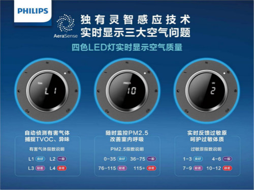 如果说净化是肉眼不可见的工作过程,那飞利浦空气净化器更能够让净化一目了然,家长时刻安心。搭载了最新灵智感应技术AeraSense,除了可以显示常规的PM2.5实时数值,精度媲美专业实验室的颗粒物传感器还可在 1 至 12 范围内显示检测到常见过敏原和有害气体(包括甲醛、VOC 和异味)的密度级,时刻监控家庭空气质量,帮助家人远离过敏原及其它污染的威胁;同时,机器采用了4色显示环,彩色环可提供额外的视觉提示,可从蓝色(良好)渐变到红色(较差)以指示室内空气质量,让用户对室内空气情况一目了然。