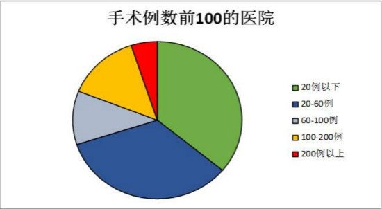 本次抽取2018年全国开展减重代谢手术例数排名前100家的医院为统计样本,共计开展手术5835例。统计发现,开展数量在20例以下的医院有36家,开展例数20-60例之间的医院有34家,开展例数在60-100例之间的医院是11家,年开展量在100例以上的为19家,其中年手术量达200例以上的手术中心全国仅有5家。
