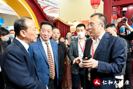 全国政协委员、民建中央委员 、仁和集团董事局主席杨文龙与宜春市委书记于秀明前来参观仁和本草酵素展台,仁和集团大健康经营委员会常务副主任、副总裁彭永振向两位领导介绍仁和本草酵素的特色和优势。